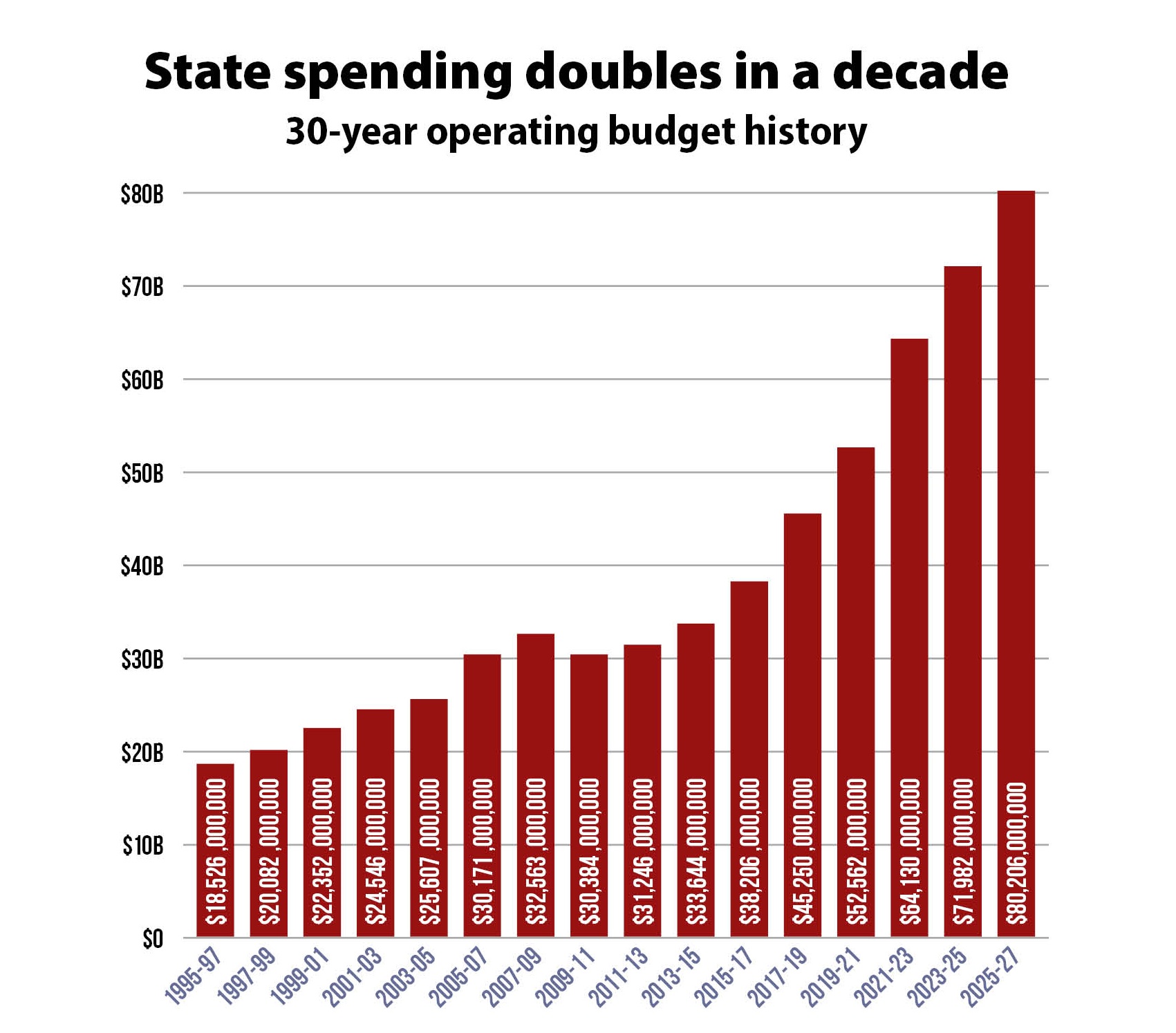 So why are we seeing this push for an income tax? It’s because our colleagues have spent the state into the hole and want to keep right on spending. This year’s budget continues the trend. It increases total spending for 2025-27 to $80.2 billion, double our budget of ten years ago. Spending has risen twice as fast as the median family income, and this rapid growth of state government is getting us in serious trouble.
